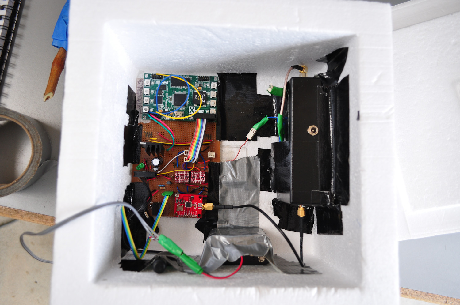 Mark's HF telemetry system was built around an Atmel XMega & signal generator, as well as an amp he'd built. It was putting out approx 40mW of power on 7.037MHz, transmitting 300b RTTY, including GPS location, temperature & battery voltages. The goal of the flight was to test the performance of the system in both harsh conditions & over a long range.